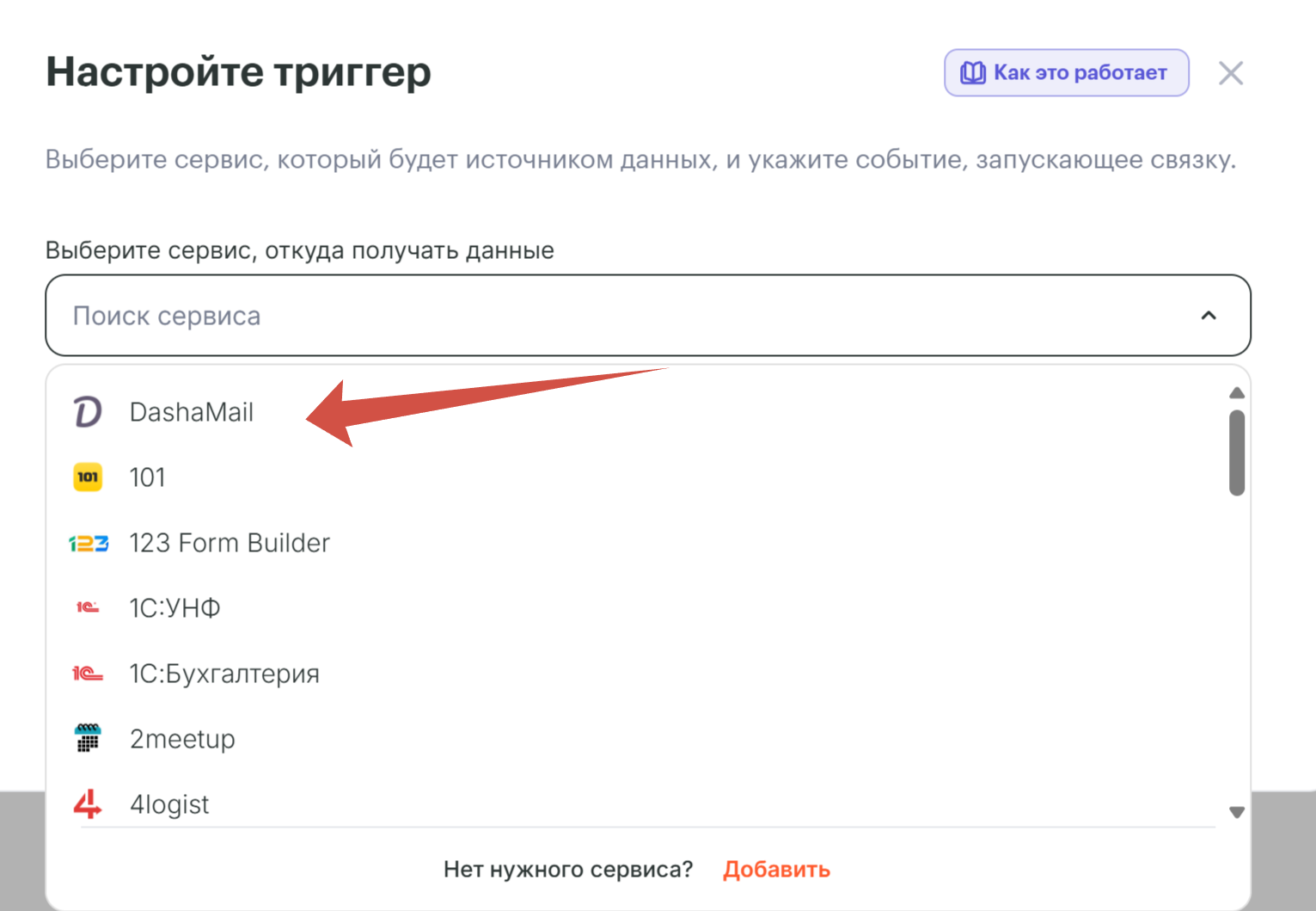 Выберите DashaMail, как сервис, из которого нужно получать данные, то есть Триггер;