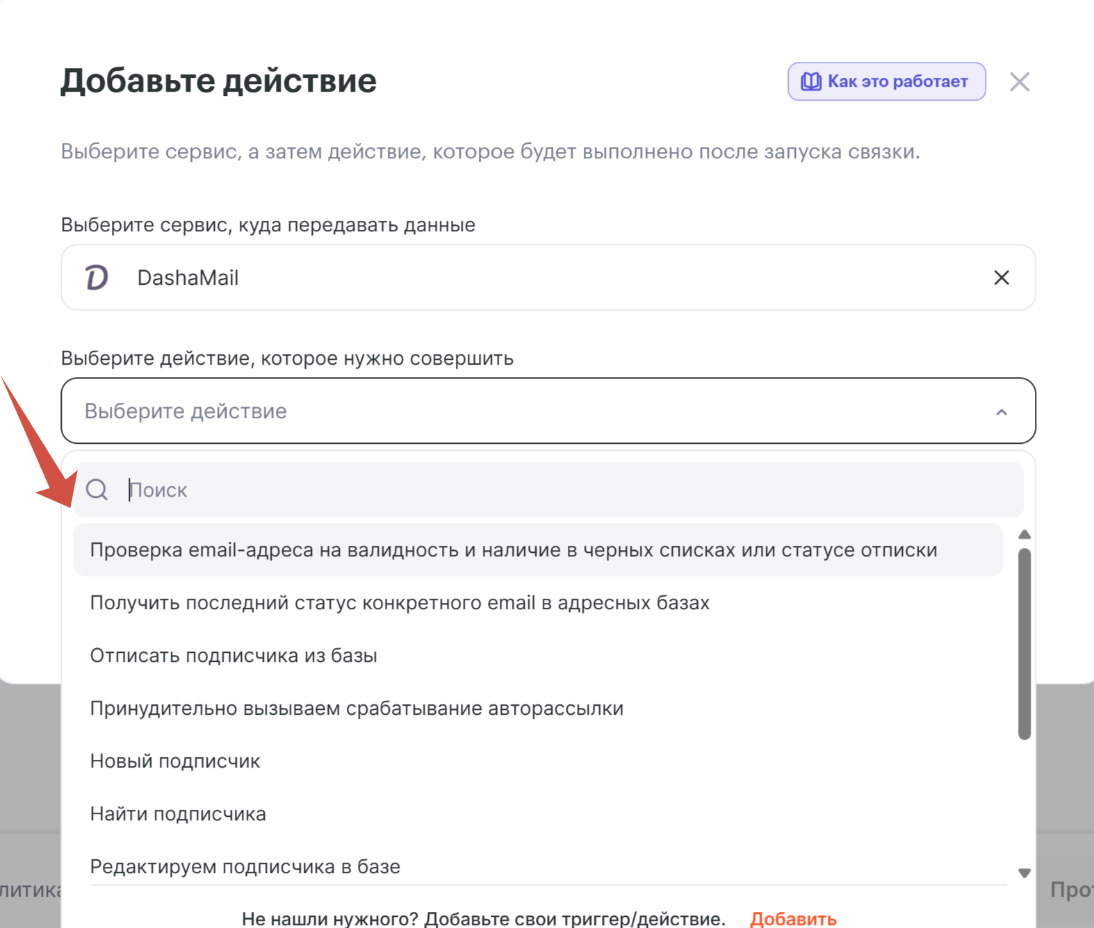 Добавьте подключение DashaMail, которое настроили в "Создание подключений";