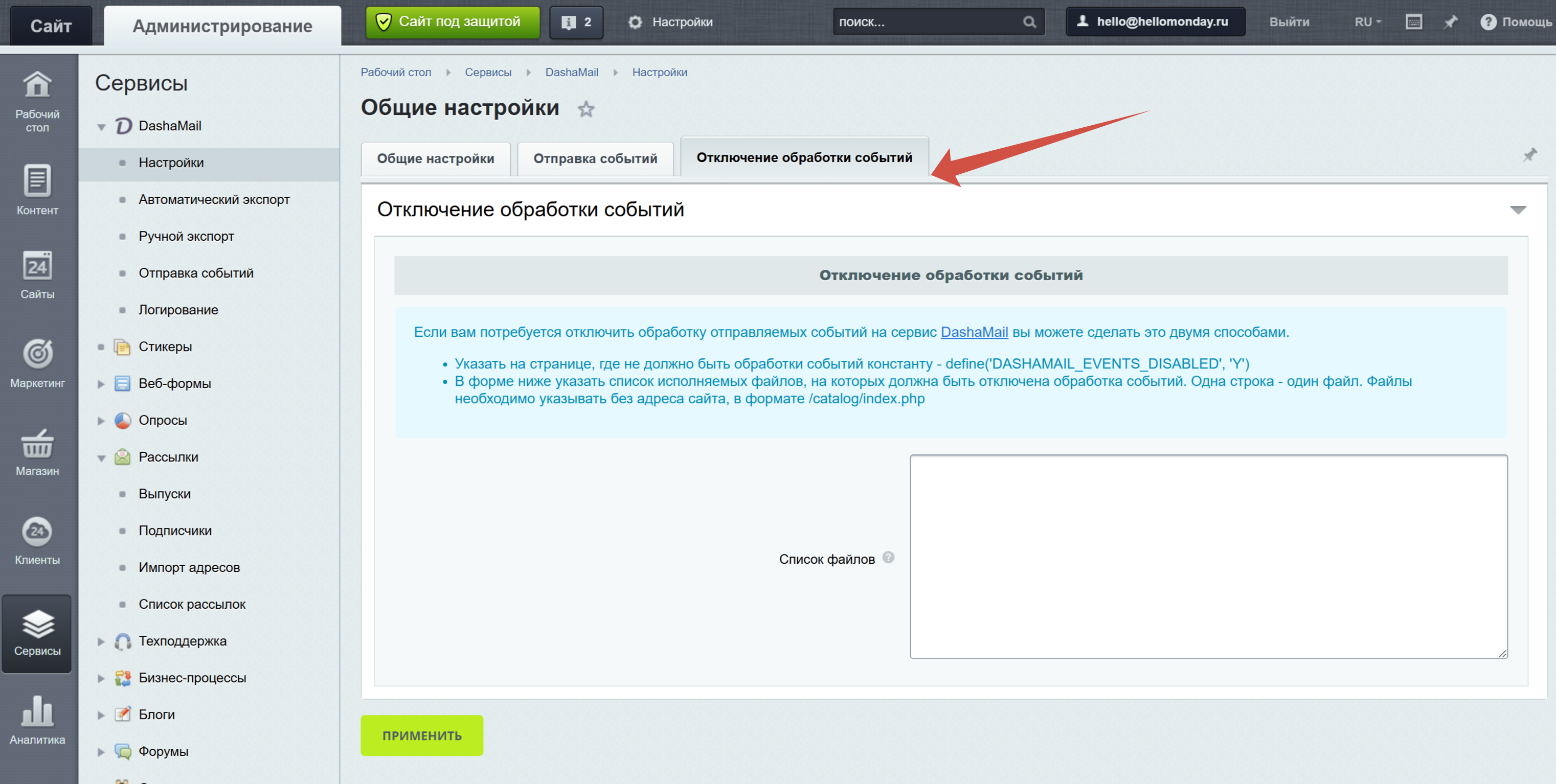 Помимо выгрузки пользователей сайта в базы, модуль также имеет возможность передавать необходимые события в сервис для последующей работы с ними в DashaMail.