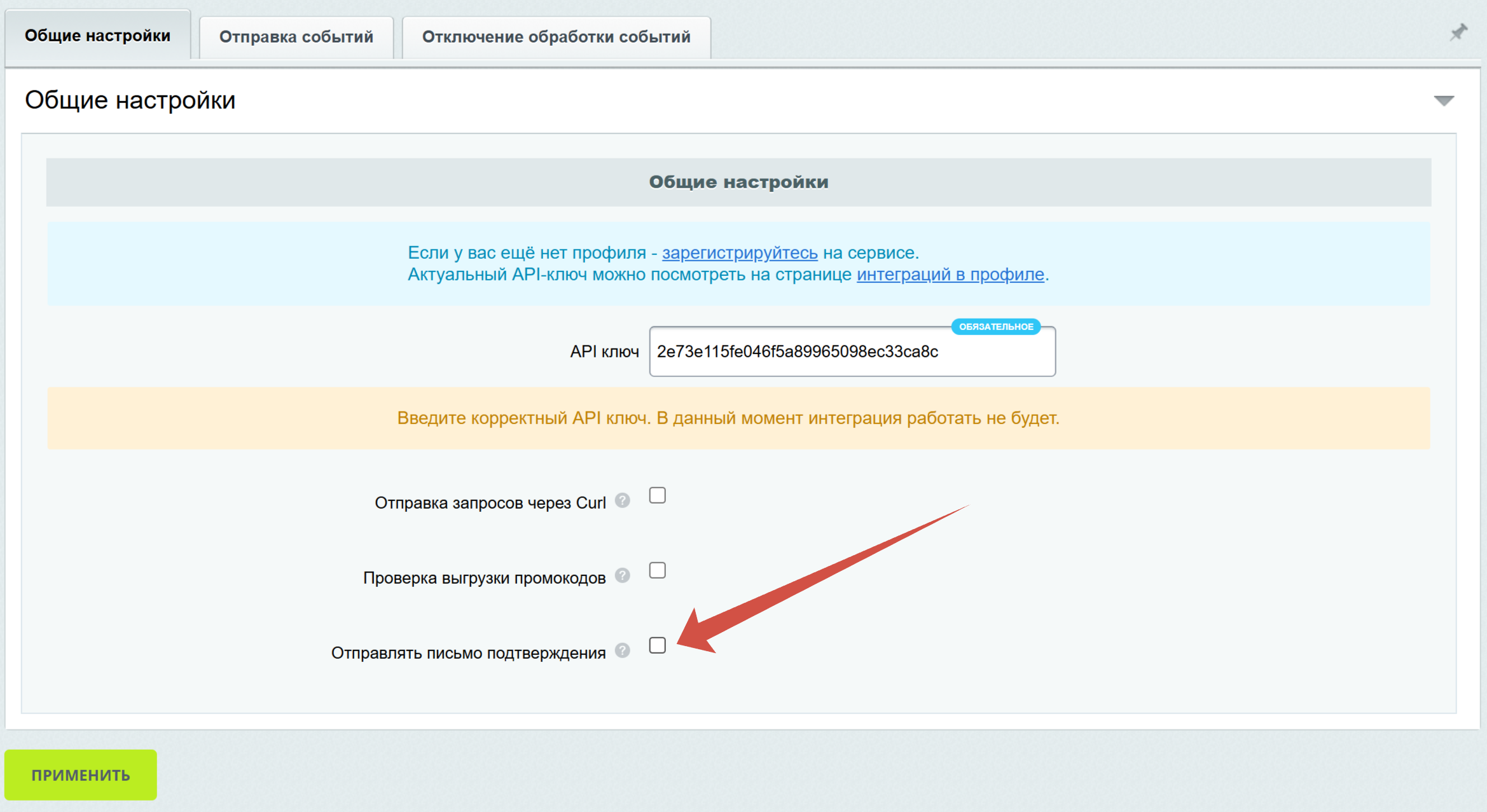 Чтобы связать ваш сайт с сервисом, необходим корректный api ключ, который можно найти на странице интеграций в личном кабинете (если у вас еще нет ЛК, то прежде всего, вам необходимо зарегистрироваться в сервисе):